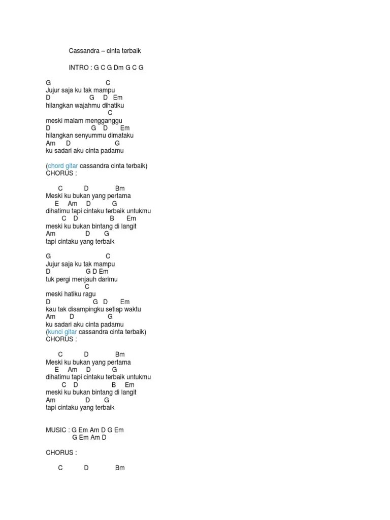 C f c g c f c g c. D g d em hilangkan wajahmu dihatiku. D g d em hilangkan wajahmu dihatiku. Jujur saja ku tak mampu Jujur saja ku tak mampu. Cinta terbaik merupakan single kedua dari album. C f jujur saja ku tak mampu. G c g dm g c g. Am d g ku sadari aku cinta . G c g am tuk pergi menjauh darimu C f jujur saja ku tak mampu Kunci gitar lagu cinta terbaik mudah dimainkan dari c. Capo di fret 1 (intro) g c g d g c g d g c jujur saja ku tak mampu.